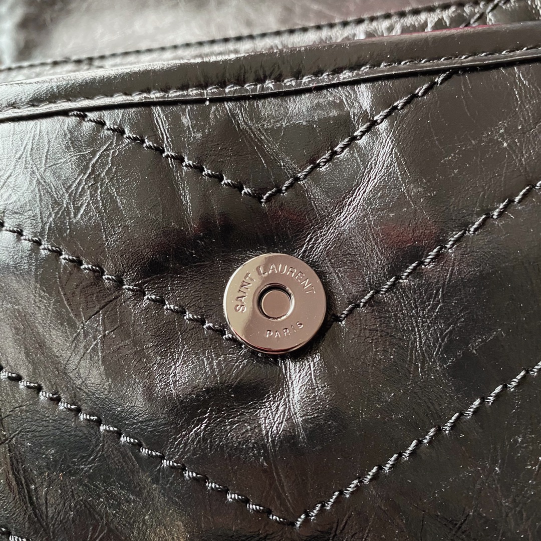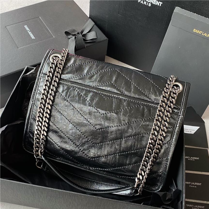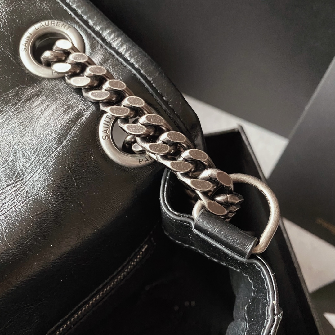 Saint Laurent Niki bag in grey and black grained lambskin.